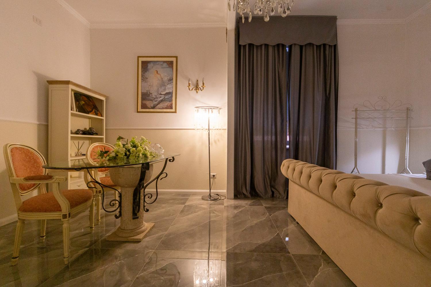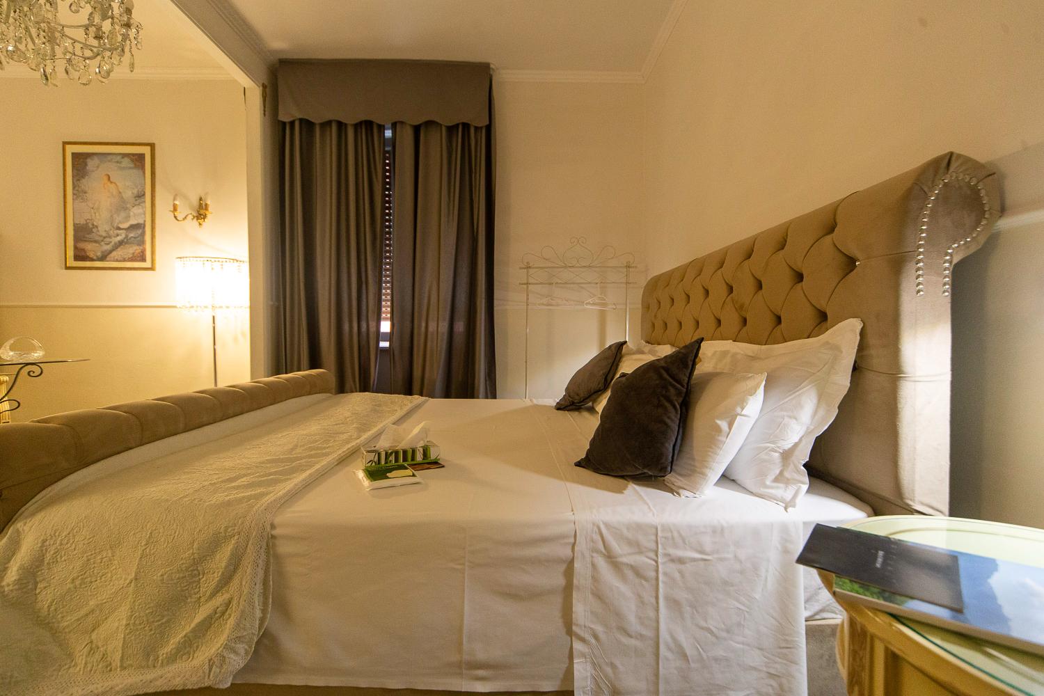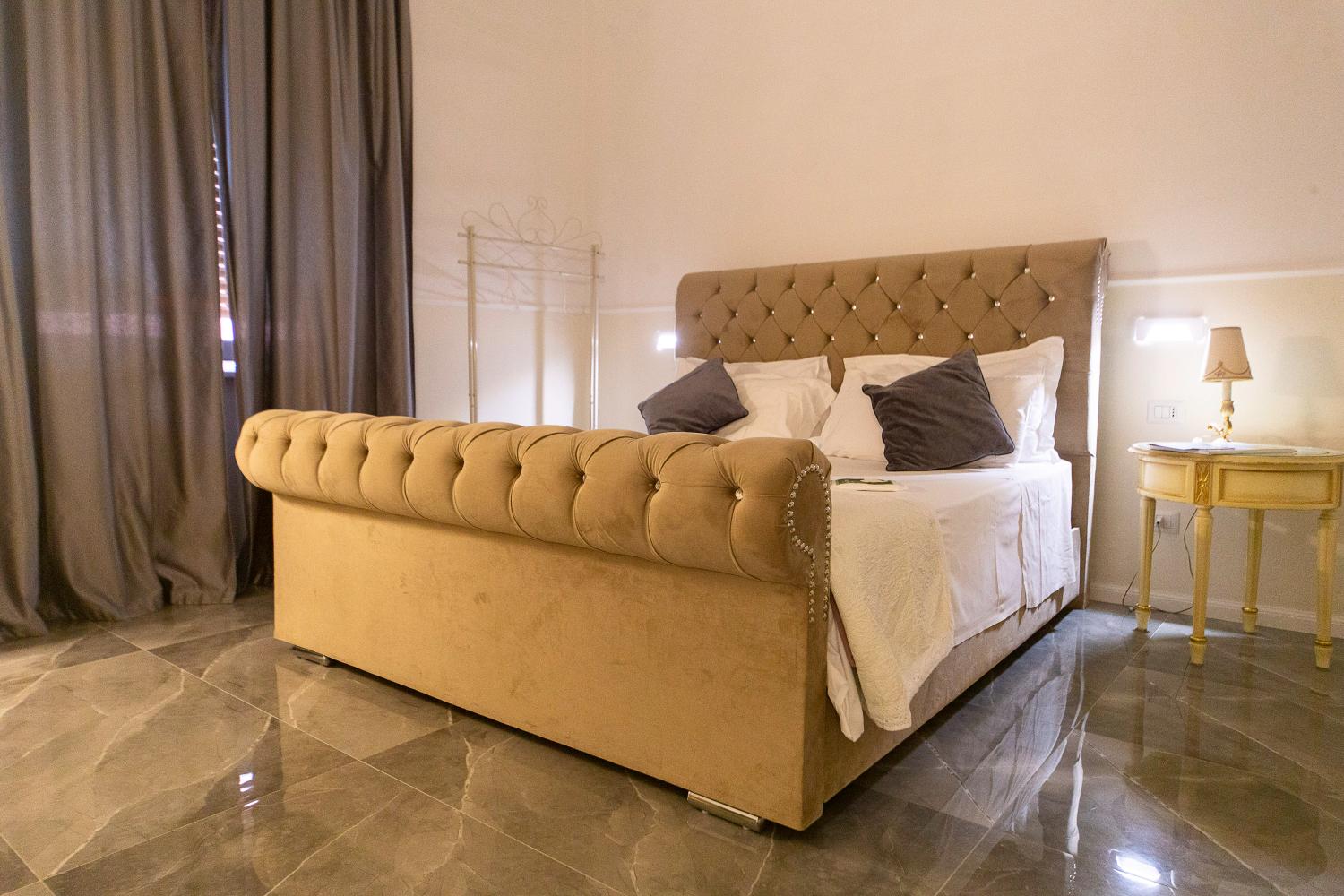 Scegliere la Camera King Deluxe di Palazzo Novecento Rooms significa concedersi un soggiorno che unisce charme, comfort e autenticità. Ogni ospite viene accolto personalmente, in un ambiente dove eleganza e attenzione convivono con un’atmosfera intima e familiare.